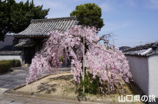 門の前には枝垂桜、境内では萩市だけでしか見れないミドリヨシノが咲き誇ります。