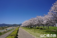 高さ10mの大きな赤いリングのモニュメントが印象的な岩国市玖珂の桜づつみ公園。島田川の右岸堤防沿いに200本の桜並木が続く河川公園となっています。![]()