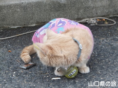 青海島入口の静ヶ浦観光センターで出会える、首輪に貯金箱をぶら下げて自らエサ代を稼ぐネコのチョロ松(現在はもも)。そしてチョロ松のご主人様のラッパのしょうちゃん。日本テレビの所ジョージの笑ってこらえてでテレビ出演し、2006年度の情報誌るるぶでも掲載されるほどで、青海島を訪れる観光客からも大人気の名コンビ。