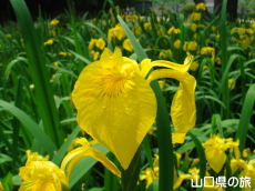 広場の奥側にはひょうたん池があり、そこにキショウブが咲いている。