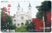 山口市のランドマーク的な存在で、市民に親しまれている初代「山口サビエル記念聖堂」テレホンカード。初代というのは、1991年に火災で全焼して、現在のサビエル記念聖堂は1998年に再建されたからである。 | |